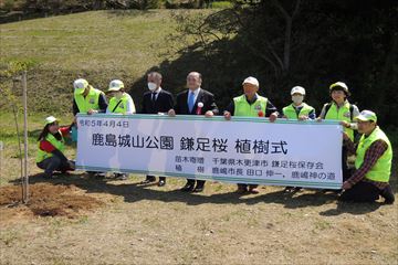 | ●鹿島城山公園 鎌足桜 植樹式 2023年4月4日、鹿嶋市の桜の名所 城山公園で、田口伸一鹿嶋市長・栗林副市長の参列のもと、木更津市より寄贈された鎌足桜の植樹式を執り行いました。鹿嶋市は大化の改新に功績のあった中臣鎌足出生の地であり、木更津市は鎌足の母の生家と伝えられ、鎌足公を介して両市は深いつながりがあります。市民に親しまれる桜になるものと期待しています。 |